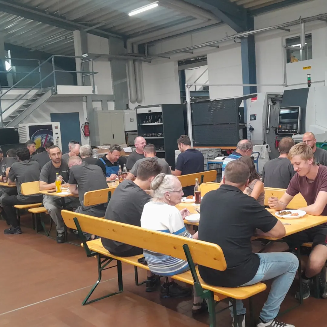 Anlässlich des 33-jährigen Firmenjubiläum hat sich die ganze Belegschaft zum Mittagessen zusammengefunden.