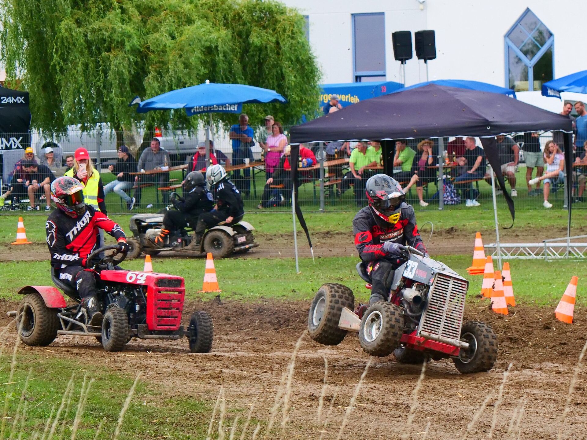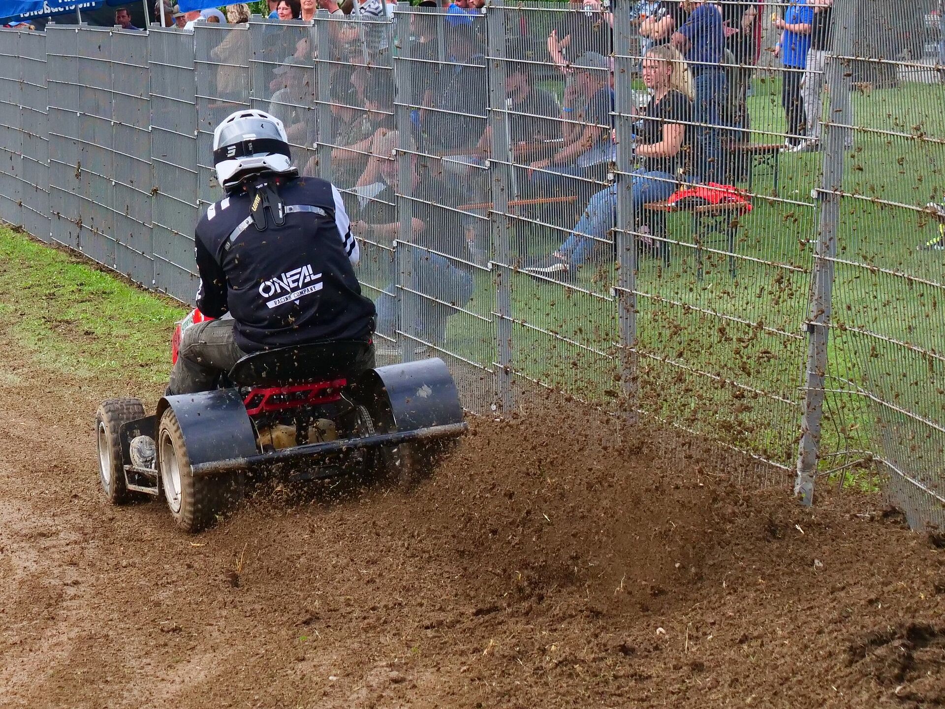 Die Teilnehmer starteten in sechs Klassen. Zur Begeisterung der Zuschauer lieferten sich die Rennfahrer auch auf der matschigen Strecke spannende Kämpfe. Und sorgten die getunten Rasenmäher bei dem heißen Wetter der letzten Jahre für Staubwolken, wirbelten sie dieses Mal viel Dreck und Matsch auf, mit denen nicht nur die Rasentraktoren, sondern auch die Fahrer reichlich übersät waren.